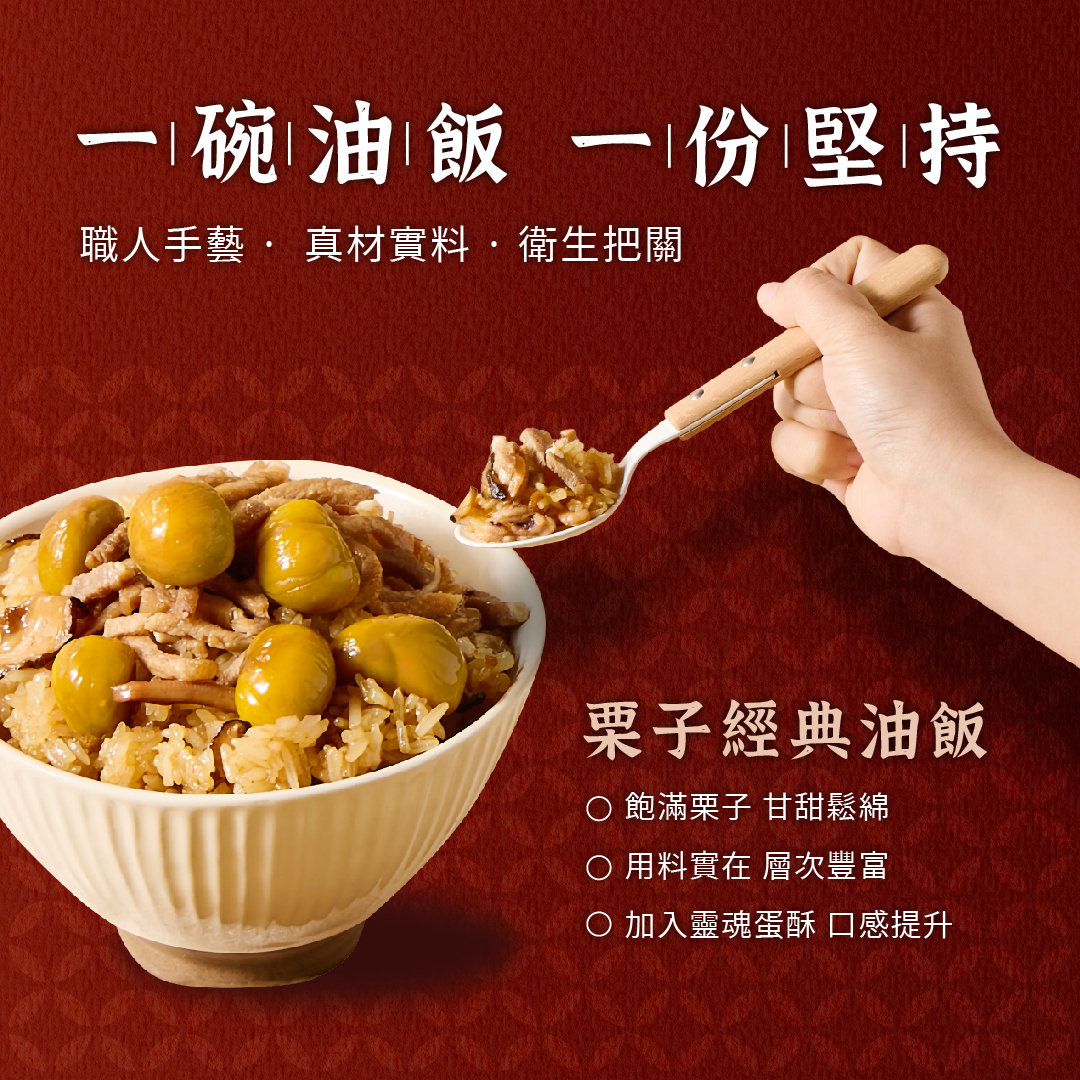 渾圓飽滿的栗子登場,拌炒的香氣誘人,口感鬆軟綿密,本身的甘甜在口中化開,一口油飯配上一口栗子,融入米與麻油香中,層層豐富,讓人愛不釋手的口味✨