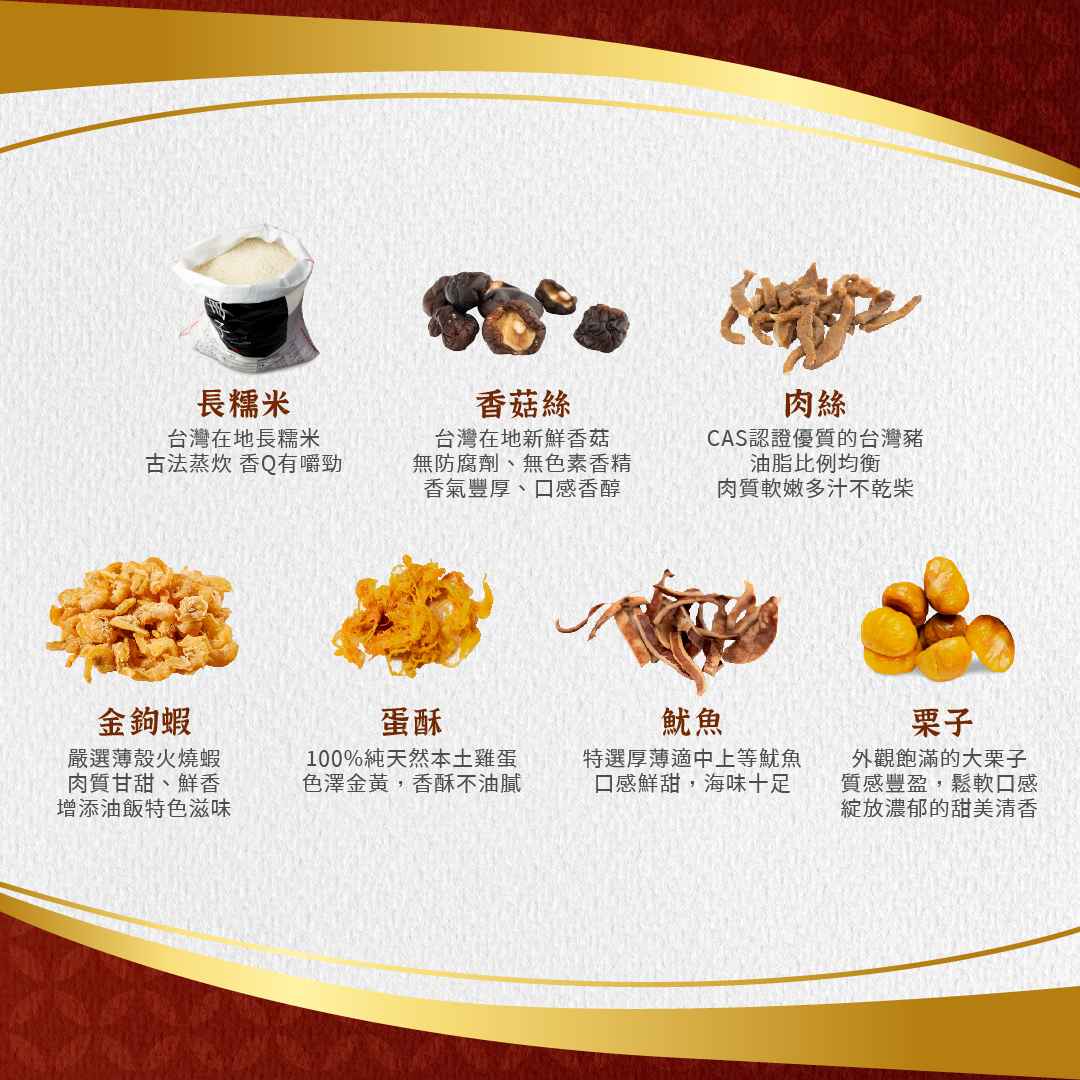 ➺ 在地食材|栗子、香菇絲、肉絲、魷魚、金鉤蝦,真材實料超滿足
