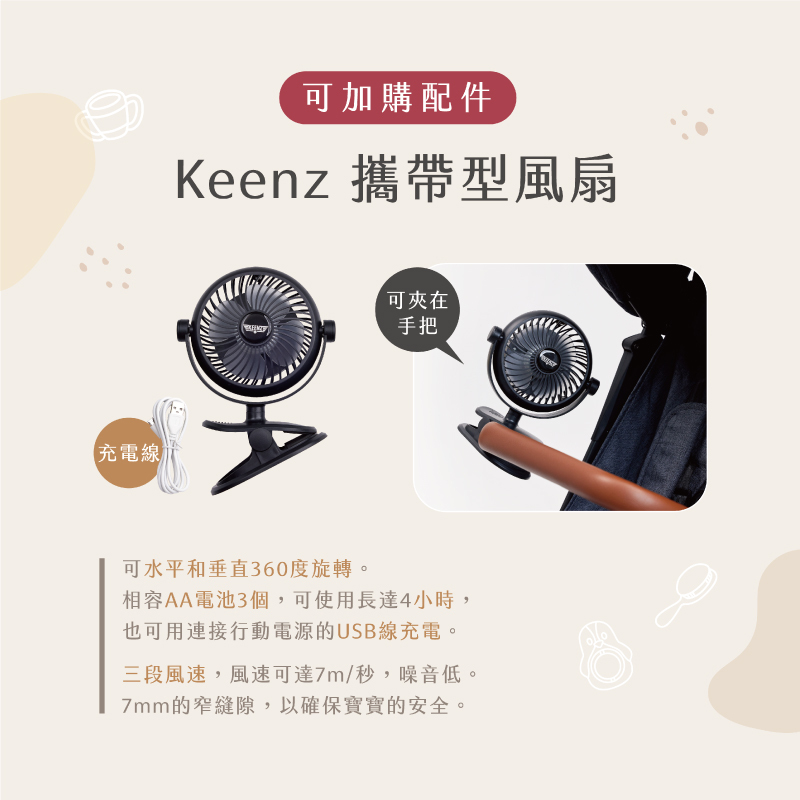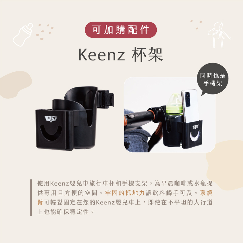 ◆多元配件:防蚊罩、防雨罩、2合1杯架兼手機架、
