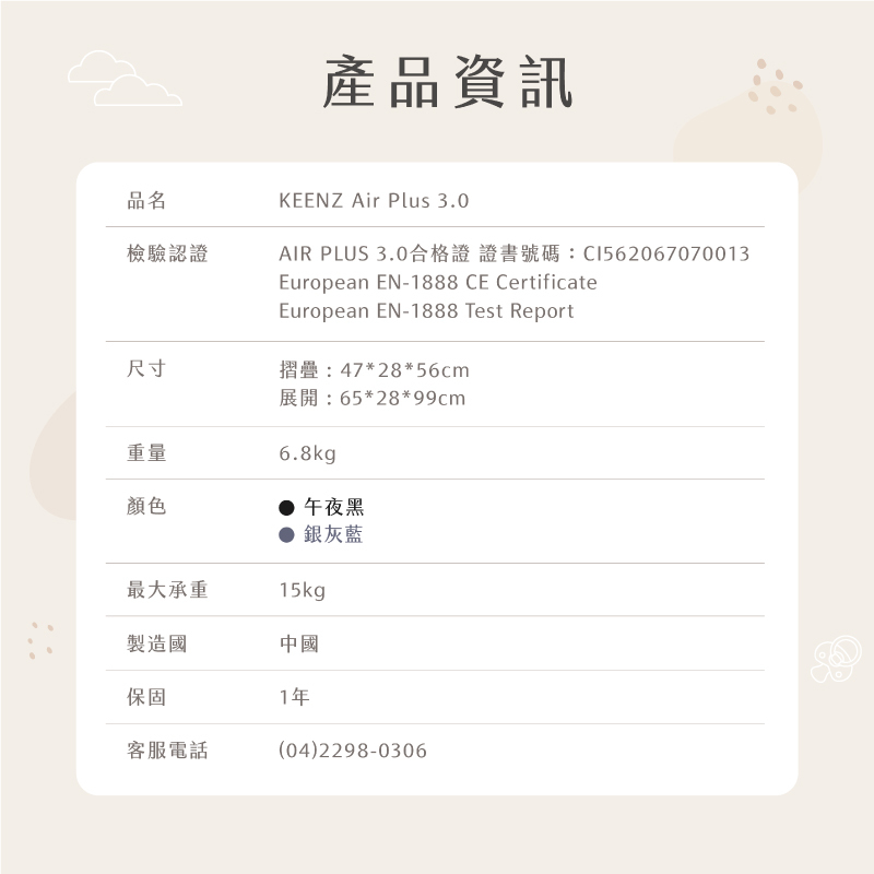 ◇內容物:杯架、防蚊帳、防雨罩、一般軟墊、餐盤、掛勾、涼感軟墊各1個