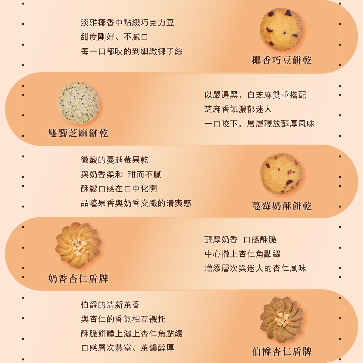 ➺ 雙饗芝麻餅乾|以嚴選黑、白芝麻雙重搭配,芝麻香氣濃郁迷人,一口咬下,層層釋放醇厚風味