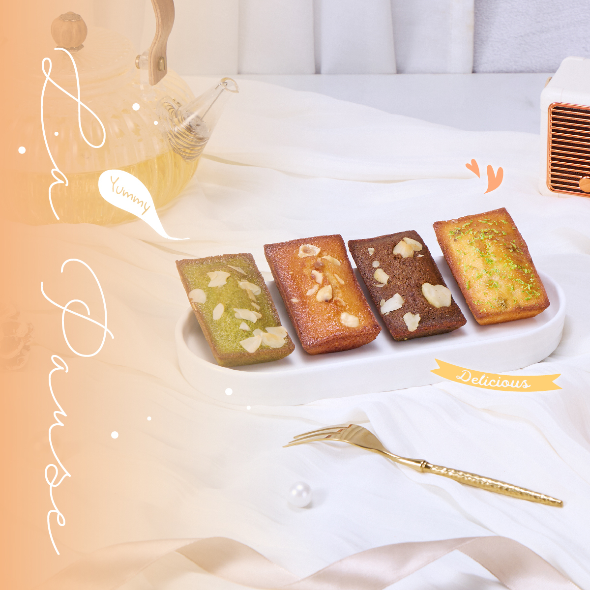 四款獨特的金磚費南雪,收藏著伯爵火山豆的茶韻、靜岡抹茶的淡雅、法式青檸的清爽、蜜香榛果的甜香,每一口都散發著幸福的滋味,為新春帶來滿滿的甜意與好運!