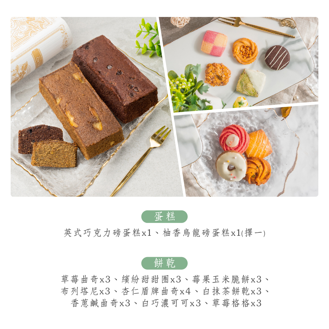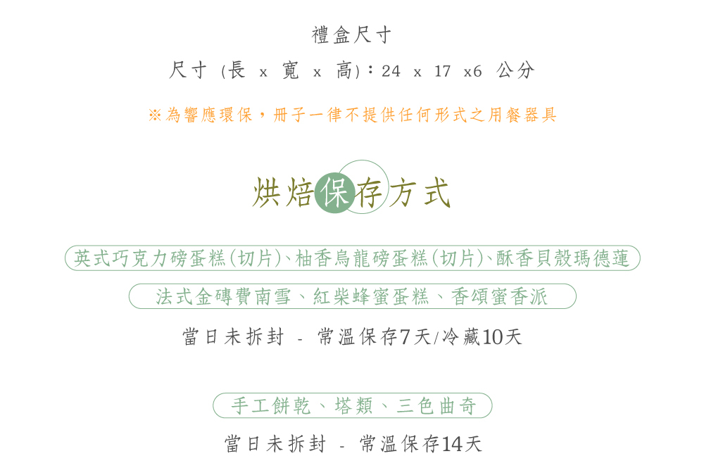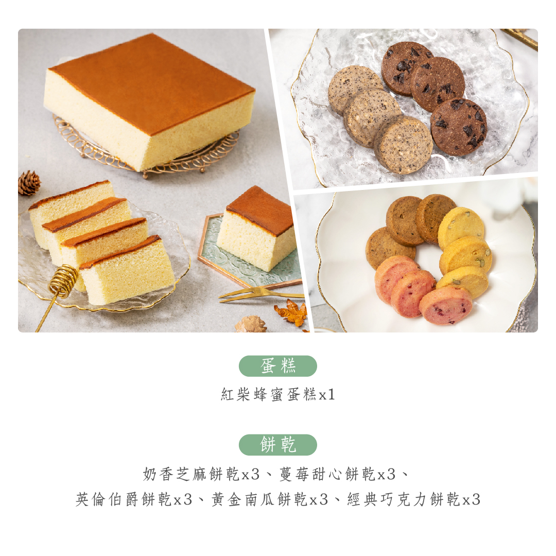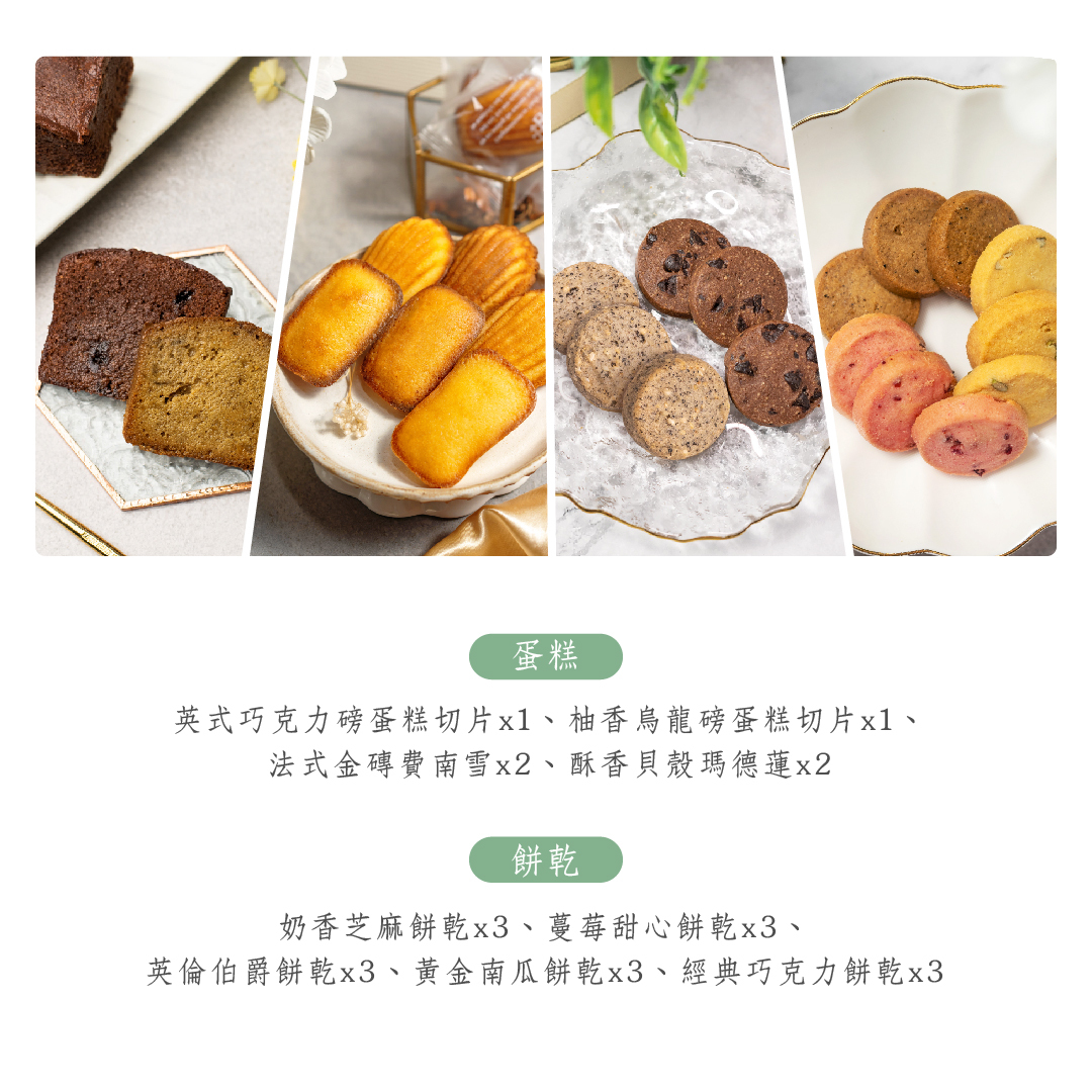 • 內容款式:糕點(蛋奶素)、餅乾(蛋奶素)