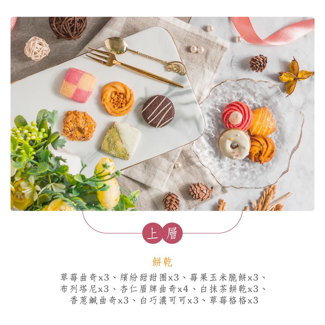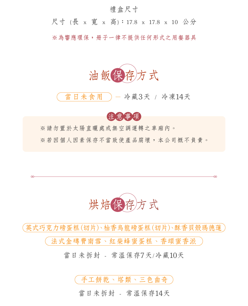 • 內容款式:雞腿紅蛋[炸雞腿/油雞腿]、糕點餅乾、紅柴蜂蜜蛋糕、雙入磅蛋糕、十六宮格餅乾、九宮格餅乾
