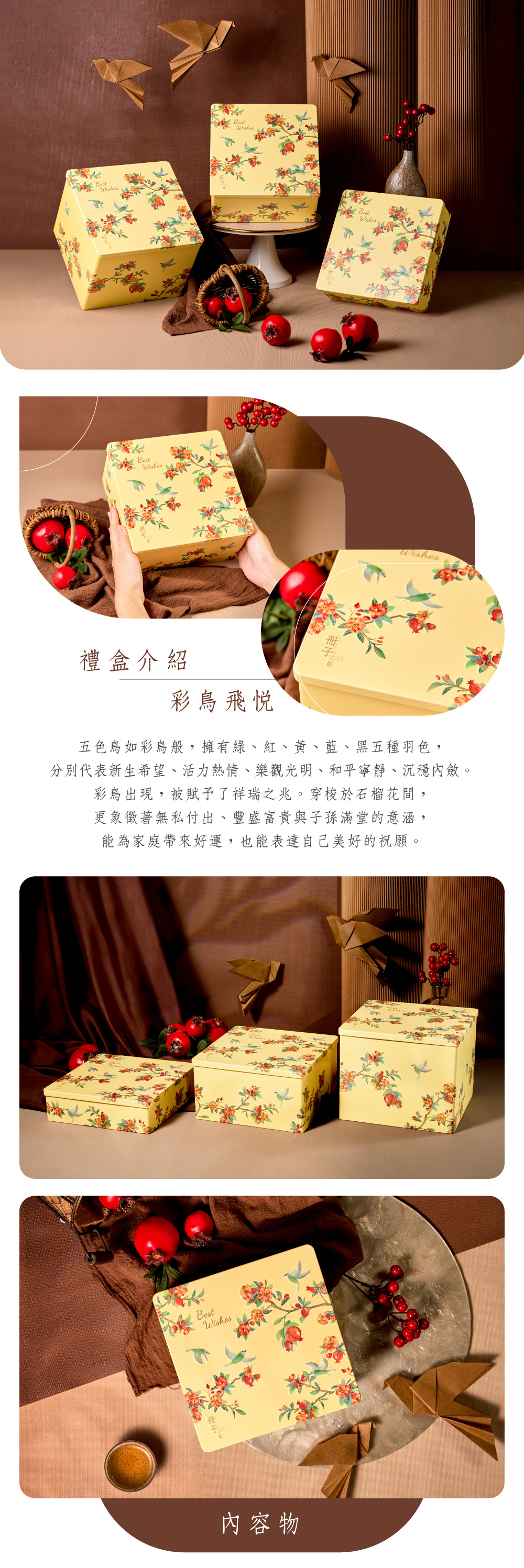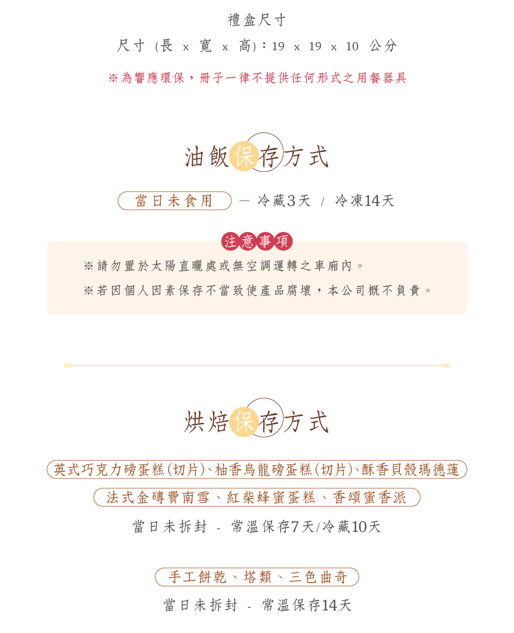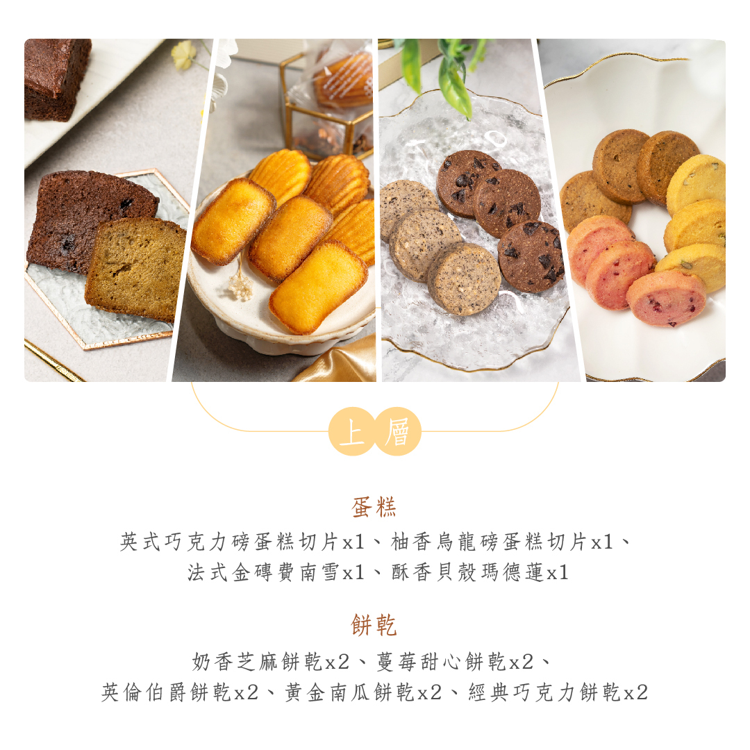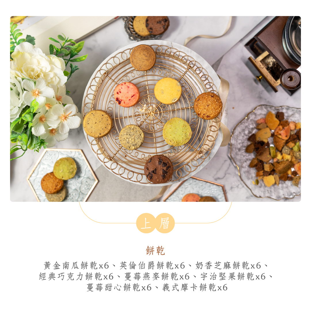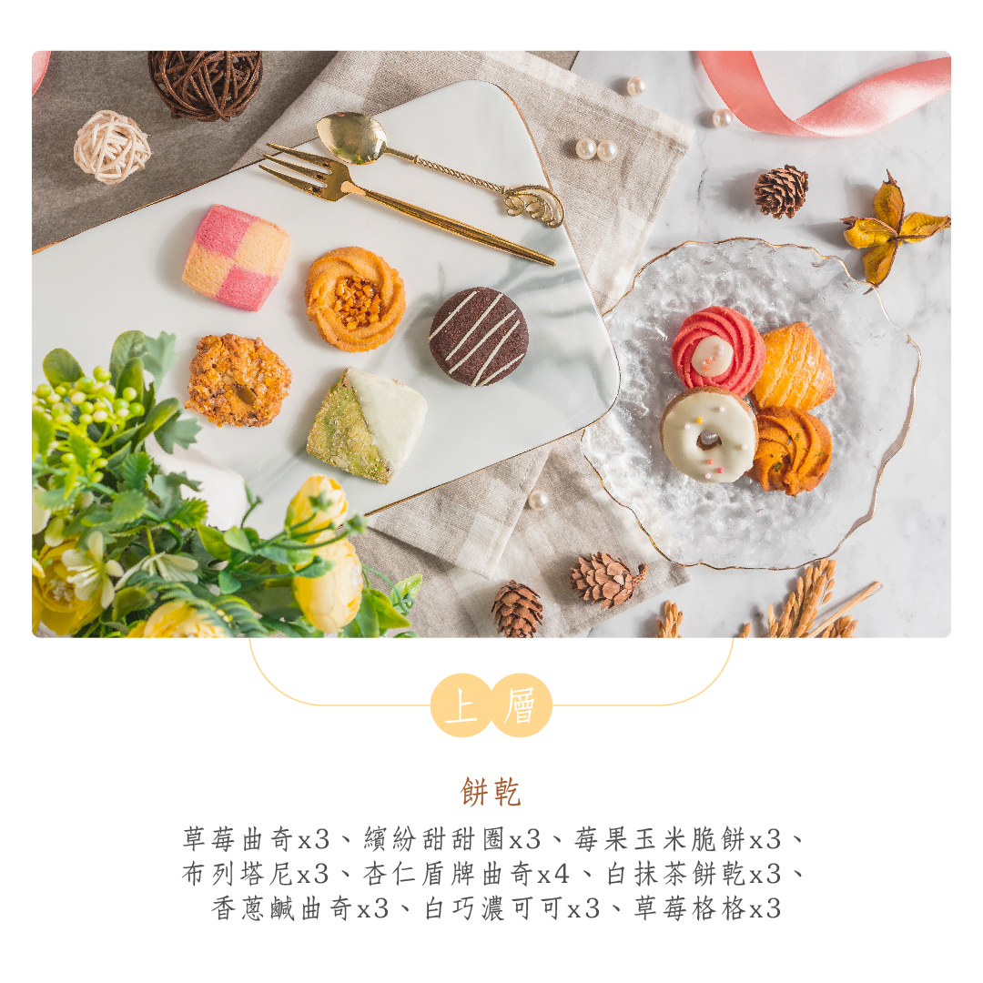 • 內容款式:雞腿紅蛋[炸雞腿/油雞腿]、糕點餅乾、紅柴蜂蜜蛋糕、雙入磅蛋糕、十六宮格餅乾、九宮格餅乾