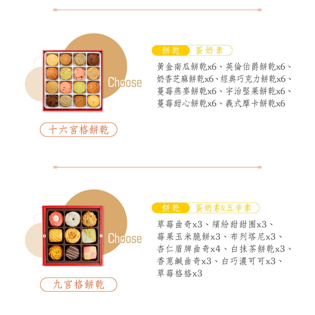 • 九宮格餅乾 (其內「香蔥鹹曲奇」)為蛋奶五辛素,其他組合皆為蛋奶素