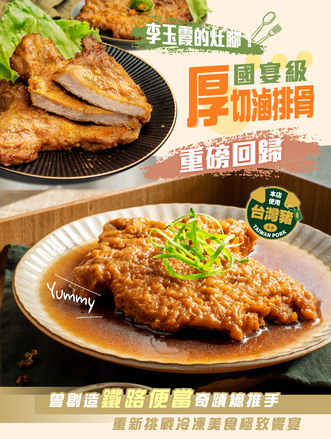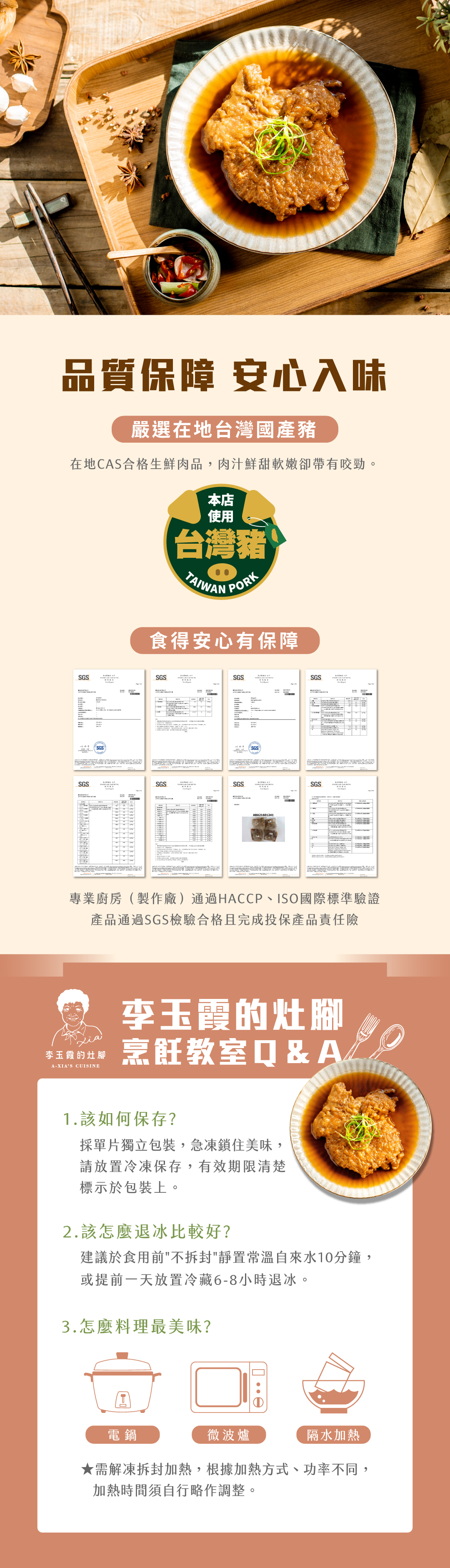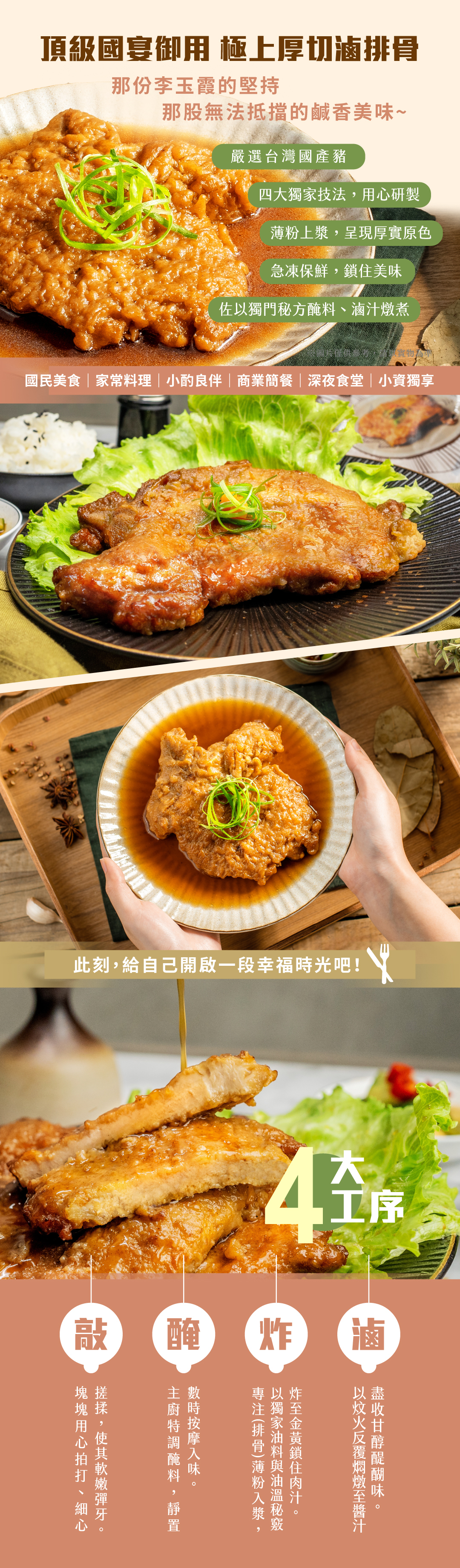 嚴選台灣國產豬,四大獨家技法用心研製,薄粉上漿呈現厚實原色,佐以獨門秘方醃料、滷汁燉煮而成。